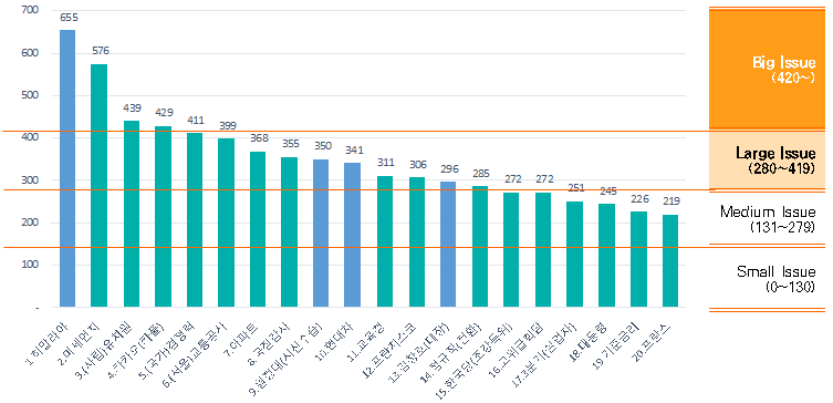 한편, 지난 주까지 관심을 받던 전원책 변호사에 대한 관심이 한풀 꺾였고, 대신 한국당(조강특위)가 순위에 올랐지만 Medium Issue에 그쳐 국민적 관심이 줄어든 것으로 보인다.