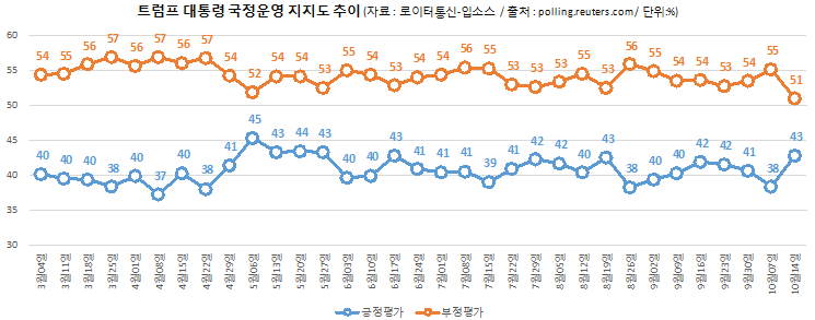 중간선거 구도가 트럼프 vs 반 트럼프로 확고한 상황이기에 중간선거에서 가장 중요한 지표는 트럼프 대통령의 국정지지도이다. 로이터통신-입소스 여론조사 결과에 따르면 트럼프 대통령의 국정지지도는 연중 50%에 미치지 못한 상황이다. 10월 14일 현재 국정지지도는 전주에 비해 소폭 상승했으나 여전히 43%에 머물고 있으며, 이에 비해 부정평가는 51%로 절반 이상의 미국민은 트럼프 대통령에 대해 부정적 평가를 하고 있는 것으로 나타났다.