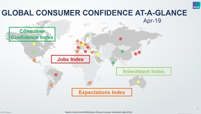 Consumer confidence up in France, Israel, and Spain; down in Latin America. The April 2019 reading of the Ipsos Global Consumer Confidence Index confirms a downward trend as it drops to 49.0. Over the past three months, the index has fallen by 0.9 point globally.
