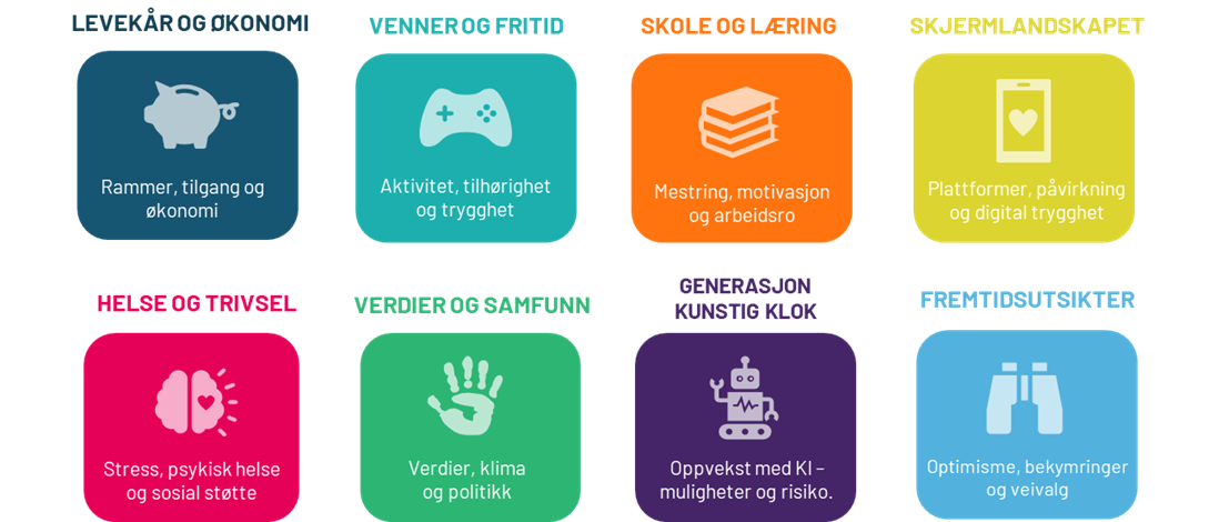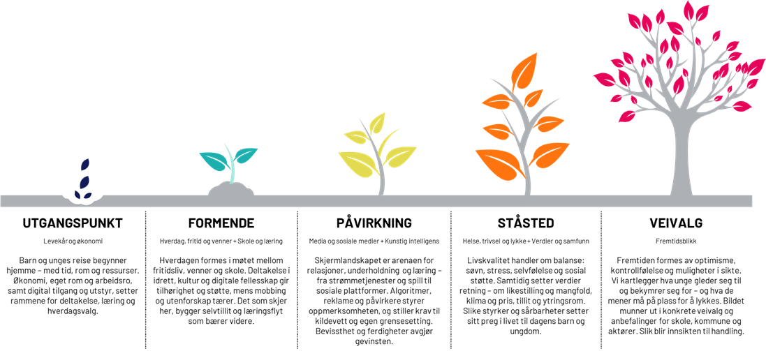 Den nye strukturen følger reisen i fem trinn. Utgangspunkt er rammene hjemme: levekår og økonomi, eget rom, arbeidsro og digital tilgang – forutsetningene som former hverdagsvalg. Formende dekker hverdagen der den faktisk skjer: fritid, venner og skole – tilhørighet og deltagelse som bygger selvtillit, og skolemestring som skaper faglig flyt. Påvirkning samler hele skjermlivet: plattformer, innhold, påvirkning og sikkerhet i én modul, og går dypere i Generasjon kunstig klok – om hvordan KI allerede er blitt et lærings- og skapingsverktøy. Ståsted handler om livskvalitet og verdier: søvn, stress, selvfølelse og sosial støtte, sammen med verdier, klima og tillit. Til slutt kommer Veivalg: Fremtidsblikk fanger hva unge gleder seg til og hva som bekymrer – og hva de mener må på plass for å lykkes.
