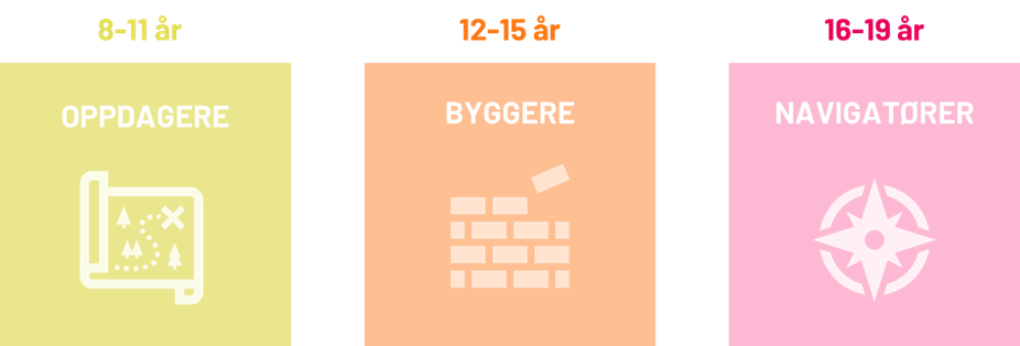 Behov og drivere endrer seg med alder: Oppdagere (8–11 år) er nysgjerrige og lærer best i trygge rammer med korte, tydelige forklaringer. Byggere (12–15 år) former vaner, verdier og ferdigheter – venner, tilhørighet og skolepress betyr mye, og KI testes til læring og kreativt arbeid. Navigatører (16–19 år) tar større valg om utdanning, jobb og økonomi, bruker KI mer målrettet, og balanserer frihet, søvn og stress med blikket fremover. Den nye strukturen er designet for å gi mening på tvers av alder.