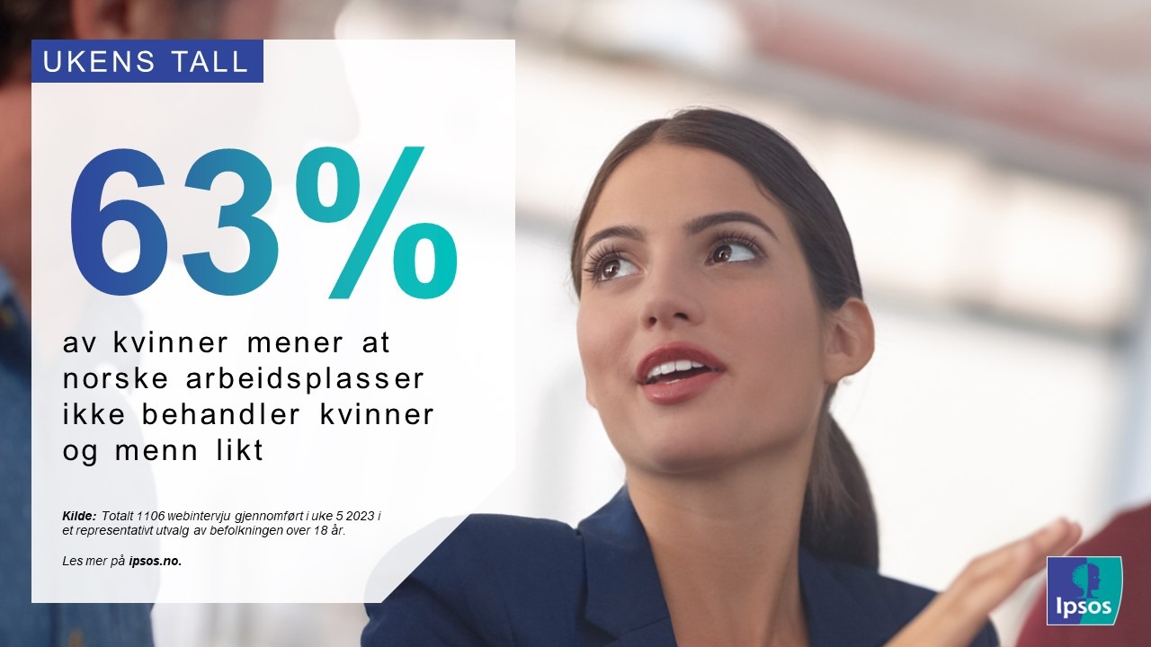 Totalt er 45 prosent av befolkningen helt- eller delvis enig i påstanden om at norske arbeidsplasser behandler kvinner og menn likt. Det er imidlertid forskjeller mellom kjønn. Tre av fem, eller 63 prosent, av kvinner er helt- eller delvis uenig i denne påstanden, mens det samme gjelder 35 prosent av mennene spurt i undersøkelsen.