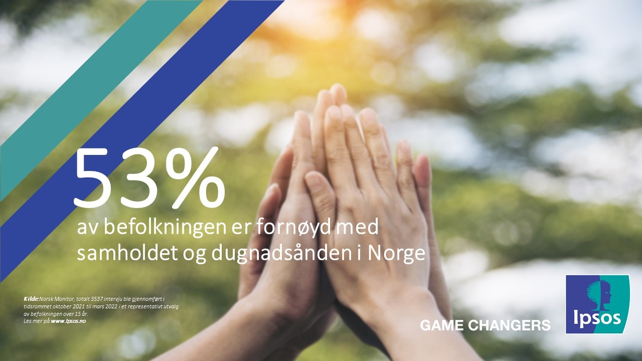 Ipsos har gjennom undersøkelsen Norsk Monitor spurt befolkningen hvorvidt de er fornøyd eller ikke med situasjonen innenfor ulike samfunnsområder i Norge i dag. Deriblant ble det spurt om samhold og dugnadsånd.