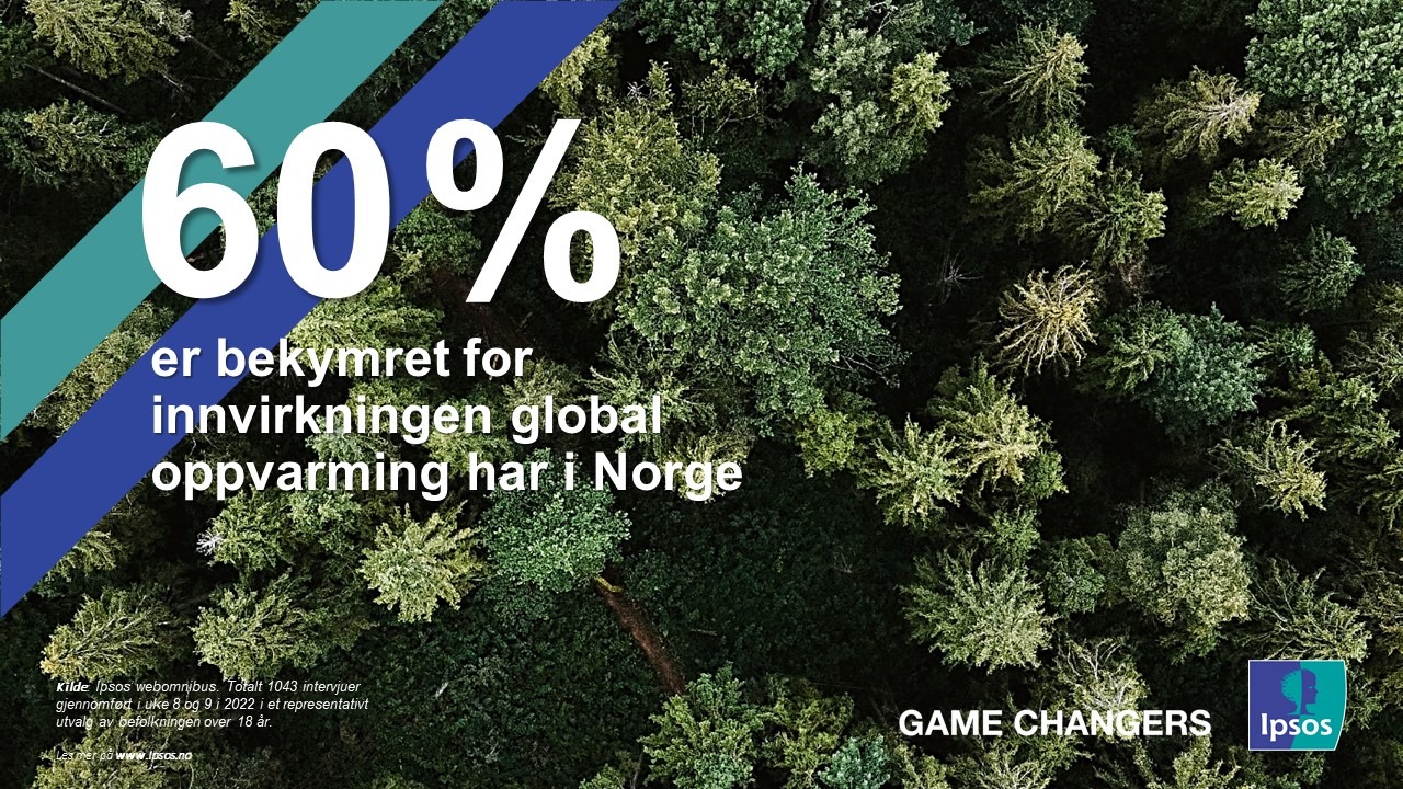 I anledning Earth Day har Ipsos gjennomført en undersøkelse i 31 land om folks holdninger til klimaendringer. I undersøkelsen kommer det frem at 60 % av nordmenn er bekymret for innvirkningen global oppvarmning allerede har hatt i Norge. Innad i utvalget ser vi at kvinner er noe mer bekymret enn menn, henholdsvis 67 % og 53 %.