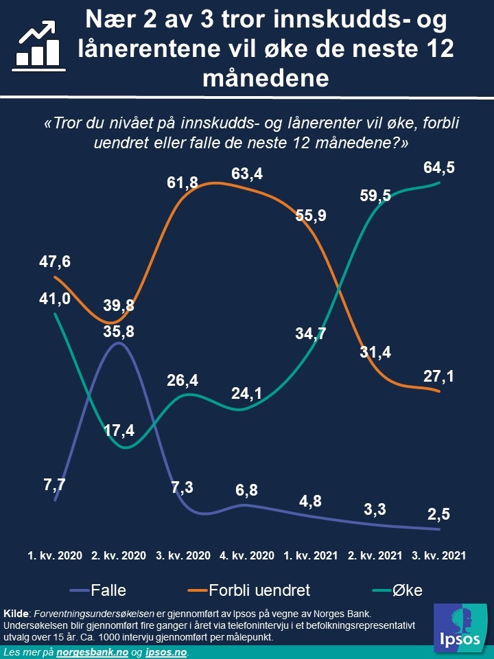 Den siste forventningsundersøkelsen viser at nær 2 av 3 tror at innskudds- og lånerentene vil øke de neste 12 månedene. Rett i underkant av 1 av 3 tror de vil forbli uendret og kun 2,5 prosent tror at de vil falle.