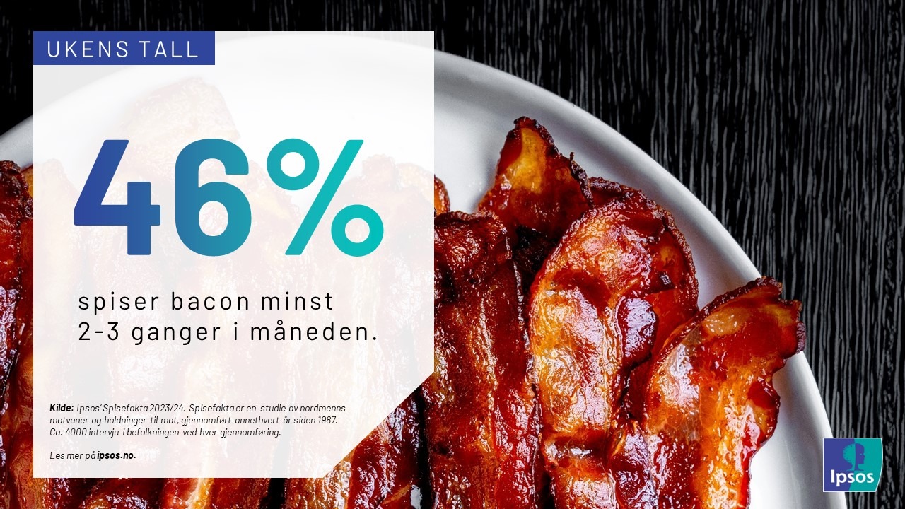Gjennom undersøkelsen Ipsos’ Spisefakta 2023/2024 har Ipsos spurt befolkningen om hvor ofte de spiser eller bruker bacon. Resultatene viser at 46 % av den norske befolkningen spiser eller bruker bacon minst 2-3 ganger i måneden. Dette har holdt seg tilnærmet uendret de siste ti årene som indikerer et stabilt forhold mellom nordmennene og baconet. I den nyeste undersøkelsen svarer 15% at de spiser bacon minst 1 gang i uken.