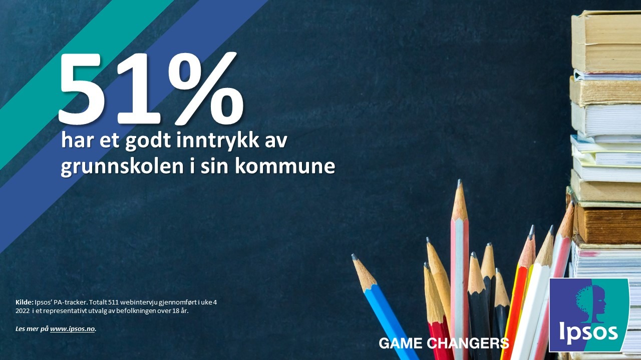 Ipsos har spurt befolkningen om hvor godt eller dårlig inntrykk de har av grunnskolen i sin kommune. Fra resultatene fremkommer det at 51 % av de spurte har et meget eller ganske godt inntrykk av grunnskolen i sin kommune. 24 % svarer at de verken har et godt eller dårlig inntrykk, mens det er 12 % som har et litt dårlig eller meget dårlig inntrykk.