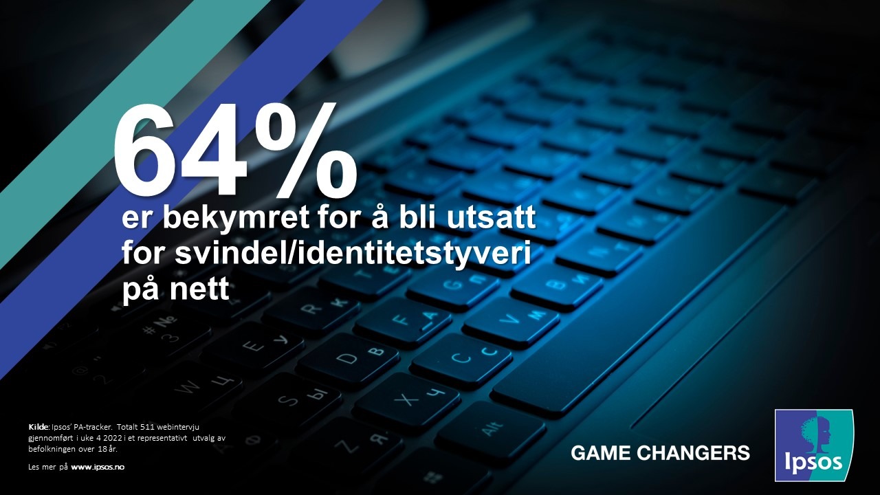 Ipsos har spurt befolkningen om de er bekymret for svindel/identitetstyveri på nett. Resultatet viser at eldre i alderen 60+ år er den gruppen som er mest bekymret, sammenlignet med yngre aldersgrupper og generelt i befolkningen. Blant personer i alderen 60+ år oppgir 81 % at de i meget stor grad, i ganske stor grad eller i noen grad er bekymret for å bli utsatt for svindel/identitetstyveri på nett. Blant den yngste aldersgruppen, 18-29 år, oppgir 53 % det samme. Av de i aldersgruppen 30-39 år oppgir 56 % at de i meget stor grad, i ganske stor grad eller i noen grad er bekymret for dette.
