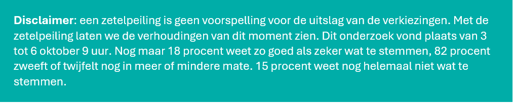 50PLUS komt in deze peiling uit op twee virtuele zetels (was één op 29 september, in 2023 haalde de partij geen zetels).