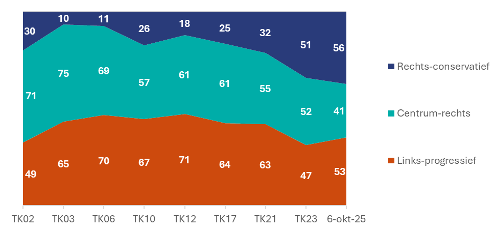 *Rechts-conservatief: PVV, JA21, BBB, FvD, SGP, LPF, LN. Centrum-rechts: VVD, CDA, NSC, CU, 50+. Links-progressief: GL-PvdA, D66, Volt, PvdD, SP, DENK, BIJ1.