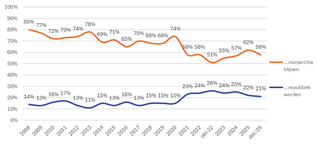 In 2008 steunden acht op de tien Nederlanders de monarchie nog. Na een langzame afname van steun daalde het draagvlak voor de monarchie fors in 2021. Toen kon de monarchie rekenen op de steun van 58 procent van de bevolking. Deze daling[1] werd o.a. veroorzaakt door onvrede over een reis van de Oranjes naar Griekenland tijdens een landelijke lockdown. In de jaren die daarop volgden is de steun voor de monarchie relatief stabiel tussen de 51 en 62 procent.[2]