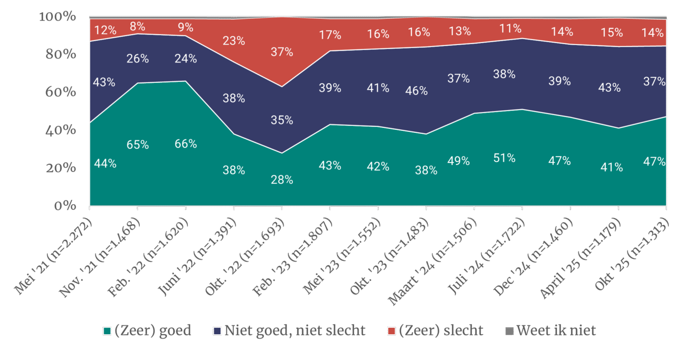 Ondanks politieke onrust, is men licht positief over de economie. Bijna de helft van de ondernemers (47%) geeft in oktober 2025 aan dat het (zeer) goed gaat met de Nederlandse economie. Dat is een lichte toename ten opzichte van de laatste meting uit april 2025 (41%). Ook het aandeel ondernemers dat denkt dat de economie in de komende 12 maanden gaat verbeteren stijgt (van 10% naar 17%).