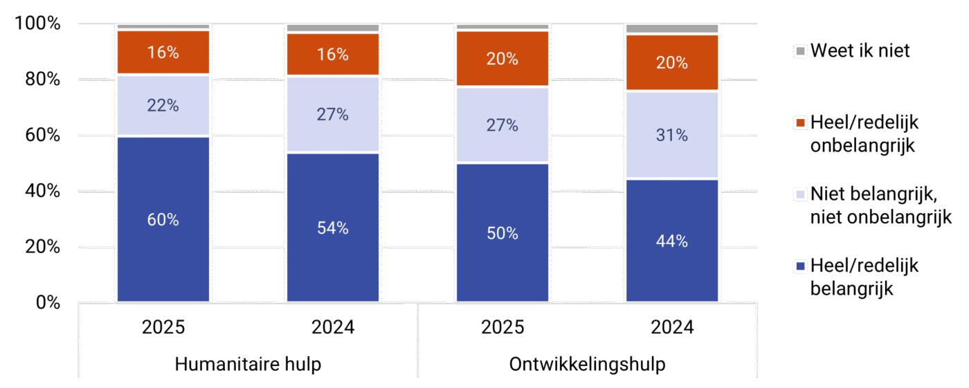Hoe belangrijk vinden Nederlanders ontwikkelingssamenwerking? Als we dat rechtstreeks aan respondenten vragen, blijkt dat de helft (50%) van de Nederlanders het ‘heel’ of ‘redelijk’ belangrijk vindt dat Nederland ‘financiële hulp geeft aan landen om zich verder te ontwikkelen’. Eén op de vijf (20%) vindt het onbelangrijk, de rest heeft er geen uitgesproken mening over. In 2024 zei slechts 44 procent deze hulp belangrijk te vinden. Zes op de tien (60%) vinden het daarnaast belangrijk dat Nederland humanitaire hulp biedt (was 54% in 2024).