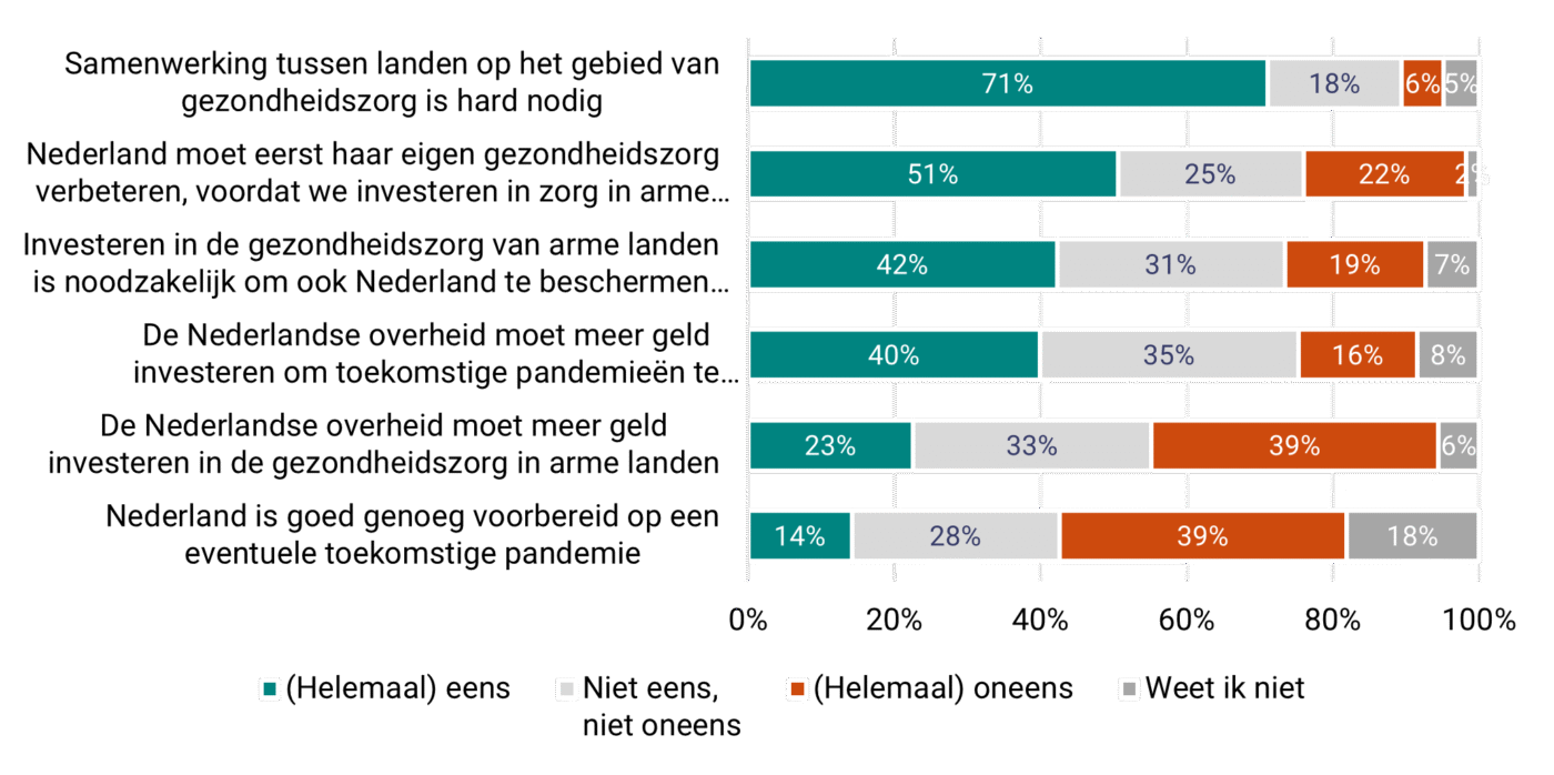 Investeringen om pandemieën te voorkomen kunnen dan ook op meer steun (circa 4 op 10) dan tegenstand (circa 2 op 10) rekenen. Maar los van pandemieën is er weinig draagvlak om ‘meer geld te investeren in de gezondheidszorg in arme landen’: 23 procent wil dat wel, 39 procent niet, de rest staat er neutraal tegenover of weet het niet. De helft (51%) wil eerst de Nederlandse gezondheidszorg verbeteren, voordat we investeren in zorg elders. Wel vindt een duidelijke meerderheid (71%) het belangrijk dat er tussen landen wordt samengewerkt op het gebied van zorg. Voorstanders wijzen vooral op de voordelen van kennisdeling, kostenbesparing en pandemische paraatheid.
