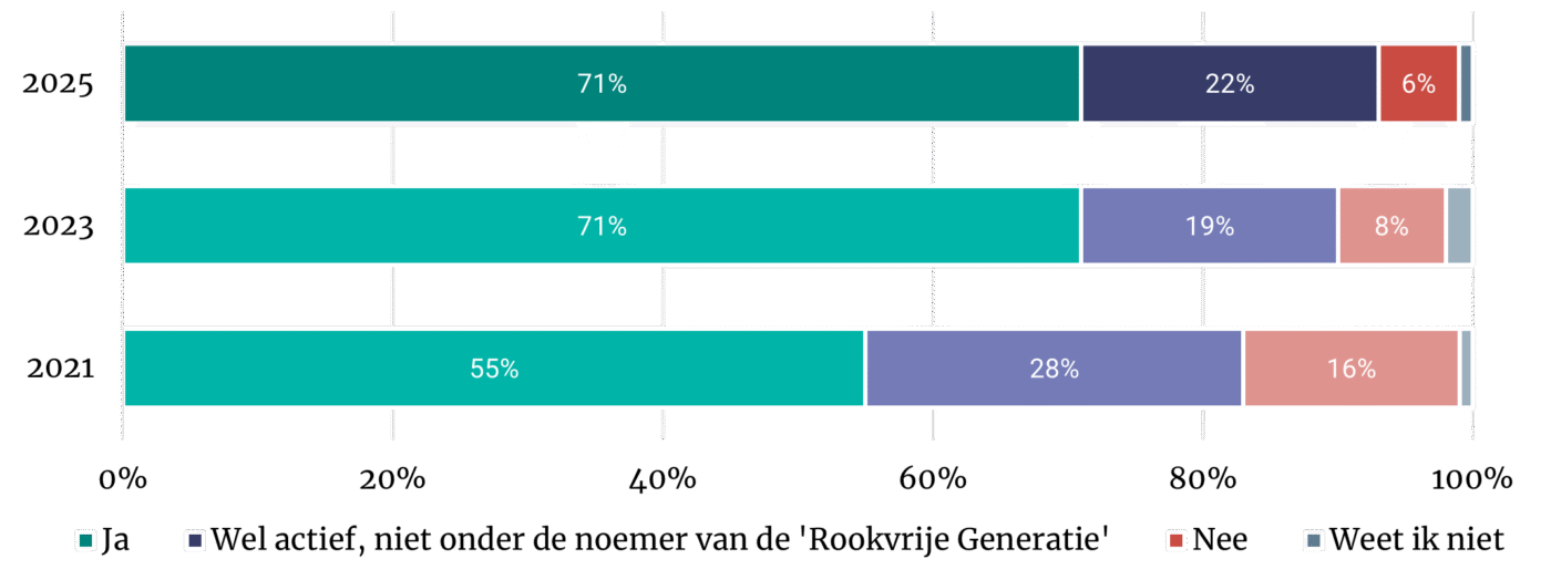 De Rijksoverheid streeft naar een Rookvrije Generatie in 2040. Bij de realisatie van de Rookvrije Generatie spelen gemeenten een belangrijke rol. Ze kunnen bijvoorbeeld bordjes, belijning en tegels plaatsen om aan te geven dat een bepaalde locatie rookvrij is of rookvrij-beleid opnemen in subsidievoorwaarden. In de afgelopen vier jaar is het aandeel gemeenten dat zich bezighoudt met rookvrije omgevingen in de gemeente gestegen van 83 procent in 2021 naar 93 procent in 2025. Driekwart van de gemeenten (77%) hebben hun activiteiten op het gebied van rookvrij beleidsmatig vastgelegd. Net als voorgaande jaren is dit vaker het geval in grote gemeenten dan in kleine gemeenten. Wel vindt beleidsmatige vastlegging meer dan voorgaande jaren ook plaats in gemeenten die niet actief zijn onder de noemer van de Rookvrije Generatie.