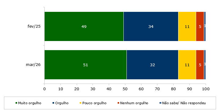 Inicialmente, a pesquisa mediu um sentimento fundamental: o orgulho de ser brasileiro. Nesse sentido, a grande maioria da população (83%) afirma ter orgulho, sendo que 51% sentem muito orgulho e 32% sentem orgulho de sua nacionalidade; 11% têm pouco orgulho, 5% têm nenhum orgulho e 1% prefere não responder à pergunta. Os dados se mantêm estáveis em relação a 2025.