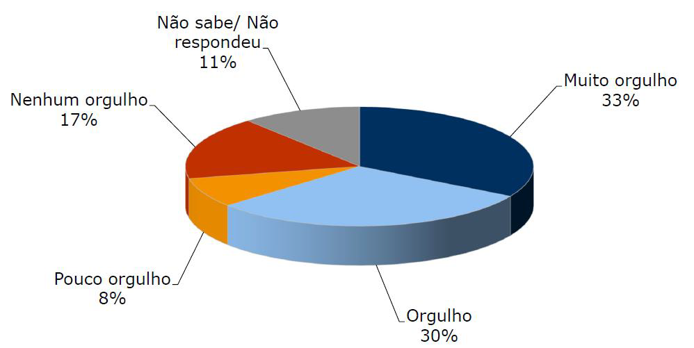 Os jovens de 16 a 24 anos são os mais entusiastas (73% se declaram com muito orgulho ou orgulho), além daqueles com renda familiar de mais de 2 a 5 salários mínimos (71%, na mesma medida). Ademais, é maior a parcela de homens (21%) que afirmam ter nenhum orgulho, na comparação com as mulheres (14%).