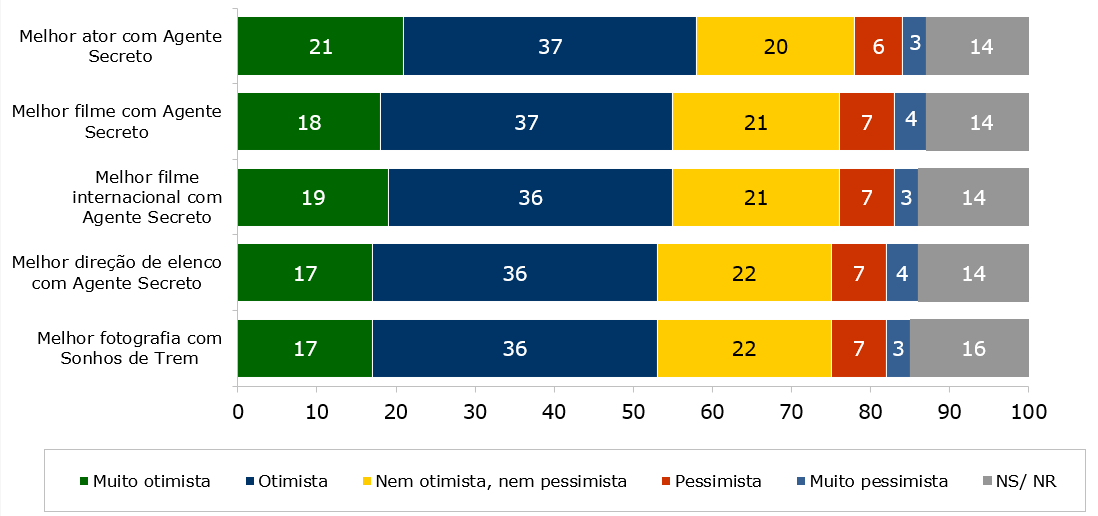 - Melhor direção de elenco por “O Agente Secreto”: 53% de otimismo, sendo 17% muito otimistas e 36% otimistas;