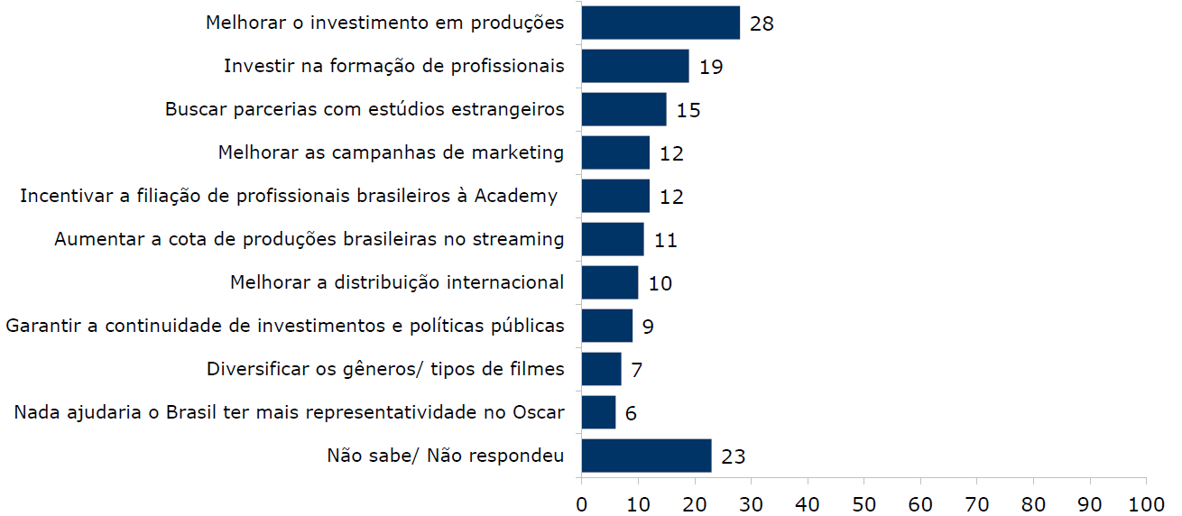 Por fim, a pesquisa investigou o que, na opinião dos brasileiros, poderia ampliar a representatividade do país no Oscar. As respostas apontam para a necessidade de estruturação da indústria cinematográfica e as soluções mais citadas foram: melhorar o investimento em produções (28%) e, em outro patamar, o investimento na formação de profissionais (19%).