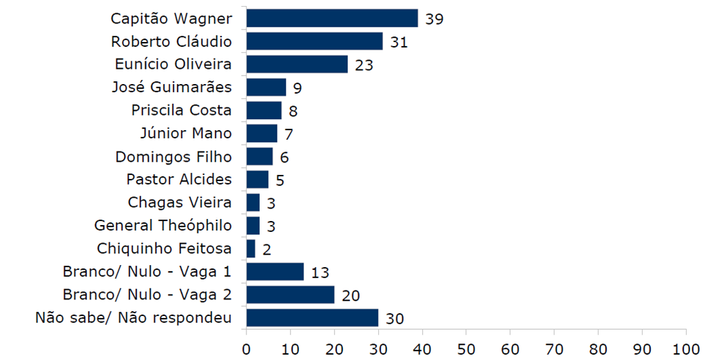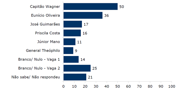 No primeiro cenário, com 11 nomes avaliados, considerando a soma das duas menções, Capitão Wagner (União) se destaca com 39% das intenções de voto. Em seguida, Roberto Cláudio (União) aparece com 31% e Eunício Oliveira (MDB) com 23%. José Guimarães (PT) registra 9% das citações, Priscila Costa (PL) tem 8%, Júnior Mano (PSB) obtém 7%, Domingos Filho (PSD) tem 6% e Pastor Alcides (PL) aparece com 5% das respostas. Chagas Vieira (PT) e General Theóphilo (NOVO) são citados por 3% dos eleitores, cada um, enquanto Chiquinho Feitosa (PSDB) é por 2%. Aqueles com intenção de votar em branco ou anular o voto somam 33%, sendo 13% para a primeira vaga e 20% para a segunda. Os que não sabem ou preferem não opinar representam 30% do eleitorado.