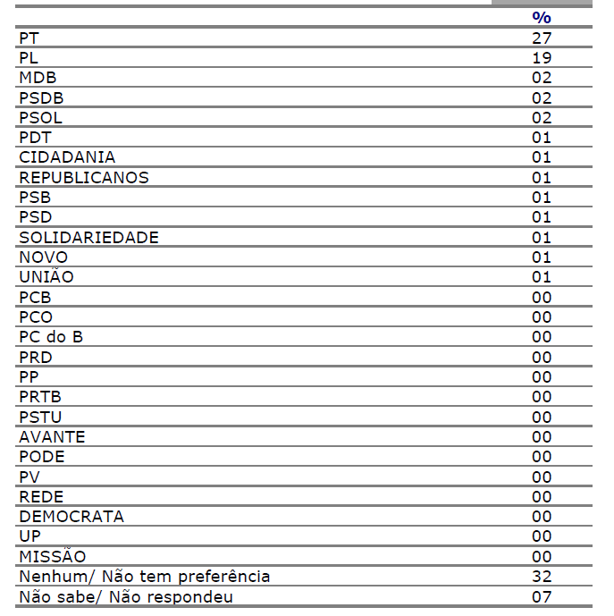 Contudo, 32% da população declara não ter preferência por nenhum partido; número que chega a 71% entre quem votou branco/nulo para presidente em 2022, a 47% entre quem não se lembra ou não votou no mesmo pleito, a 41% na região Sul, mesmo percentual entre quem considera regular a gestão de Lula e 37% entre as mulheres (ante 28% entre os homens). Outros 7% não sabem ou preferem não responder ao questionamento.