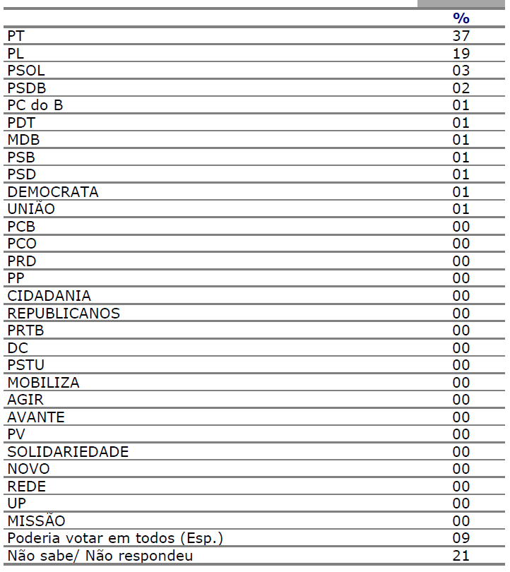 O mesmo cenário se reflete na rejeição: o PT é o partido que mais enfrenta resistência, com 37% dos brasileiros afirmando que não votariam na legenda de jeito nenhum. O PL aparece em segundo lugar neste quesito, com 19% de rejeição. As demais siglas aparecem com taxas de rejeição muito inferiores, com o PSOL sendo o terceiro mais citado, com 3%, seguido pelo PSDB com 2% e, MDB, PSB, PC do B, DEMOCRATA, PSD, PDT e UNIÃO, com 1% cada um. Ainda, somam 9% aqueles que afirmam que poderiam votar em todos os partidos e totalizam 21% os que não sabem ou nem respondem à pergunta.
