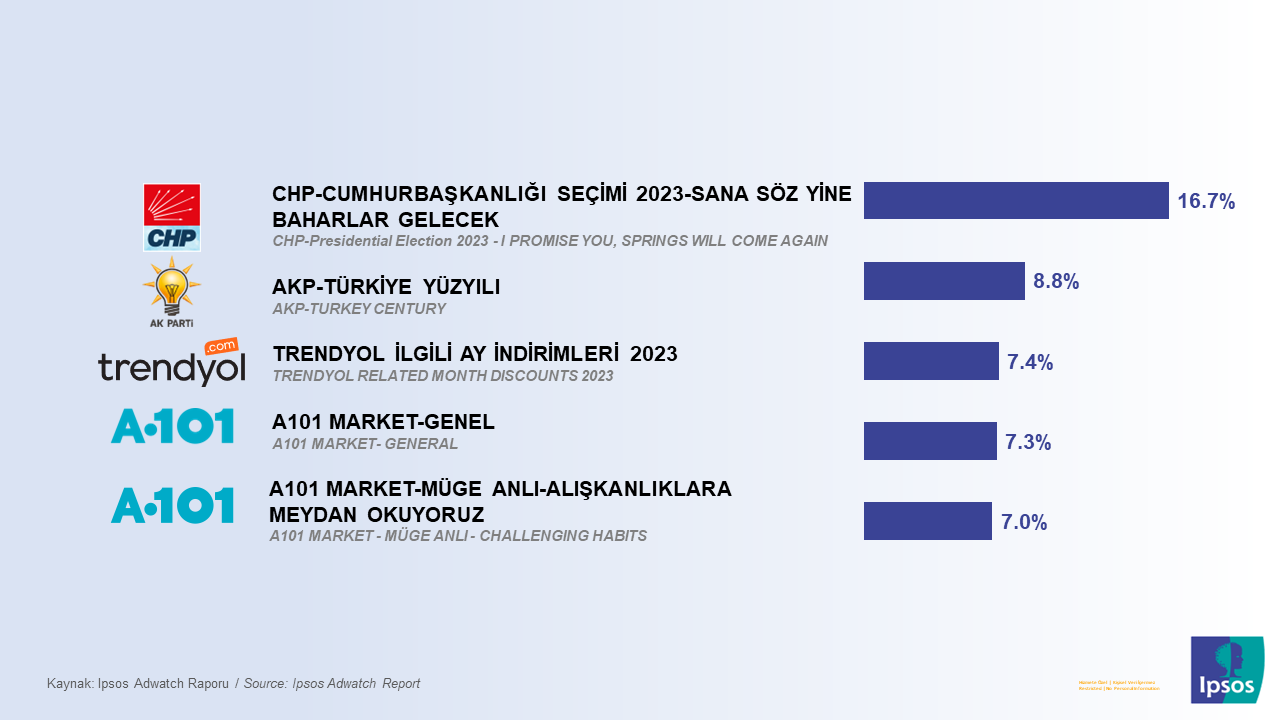 6 Şubat 2023 Kahramanmaraş merkezli 10 ili etkileyen deprem ile ulusal yas ilan edildi, markalar iletişimlerine ara verdi. Nisan ayı ile birlikte yeniden hız kazanan iletişimlerde Mayıs ayında daha önceki senelerden farklı olarak seçim reklamlarının hatırlanmalarda ağırlığı hissedildi. E-ticaret GRP yatırımları önceki dönemlere düşüş gösterse de markalar hala tüketicinin zihninde reklamlarla hatırlanıyor.