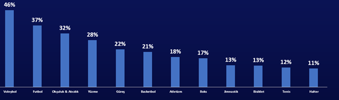 Ülkemizde Olimpiyatları izleyenlerin en çok ilgi gösterdiği branş, yıllardır bizleri başarılarıyla gururlandıran Filenin Sultanları sayesinde %46 oran ile Voleybol. Futbol, takımımızın bu yılki oyunlarda yer almamasına rağmen en çok izlenen ikinci spor dalı.