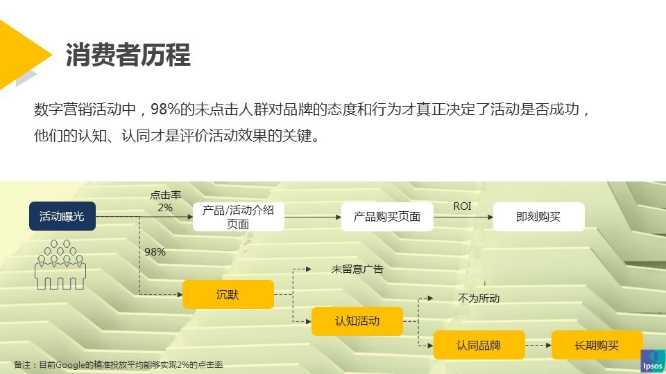 在数字化时代,广告主和品牌主较为单一地注重时效性,如点击率、关注量、购买转化率、ROI。 周晓农先生指出,实际上在数字营销活动中,98%的未点击人群对品牌的态度和行为才真正决定了活动是否成功,他们的认知、认同才是评价活动效果的关键。虽然这些人没有点击,但可能看了广告并被打动,形成了对品牌的认同,从而进行长期的忠诚购买。