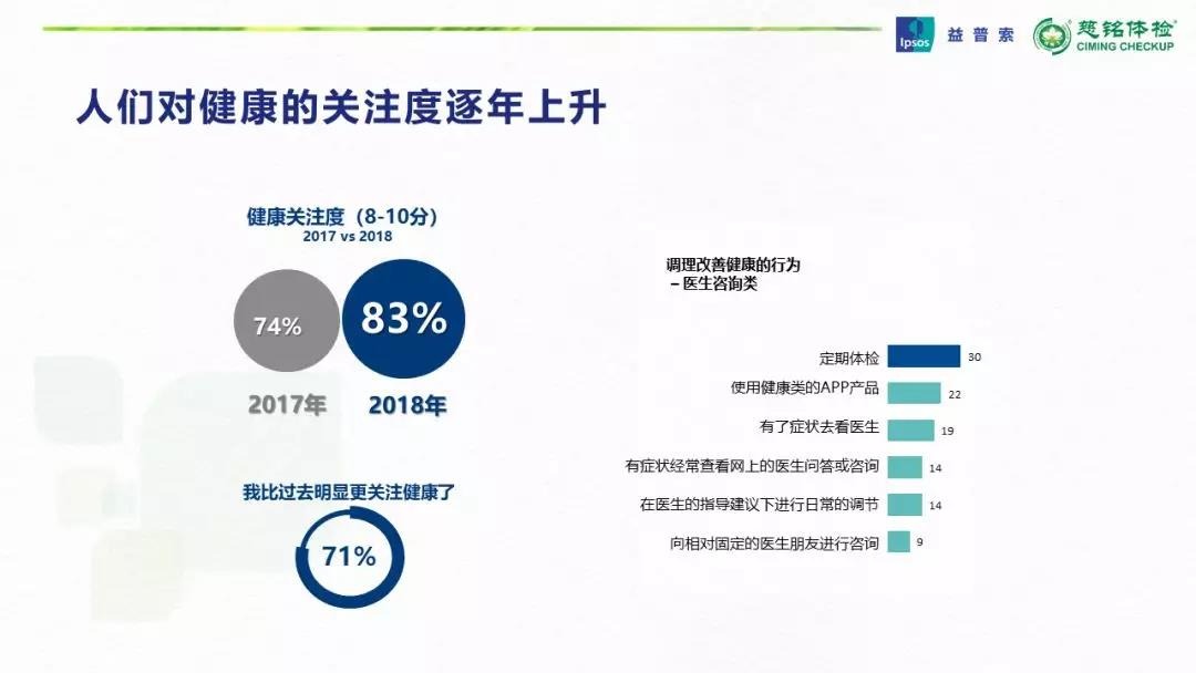 益普索Ipsos的一项市场调研数据中显示,2017年健康关注度在74%,2018年健康关注度提升到了83%,在这项调查中,对健康关注最高的项目是医生咨询类,占到了所有健康项目的71%,其中,定期体检的关注指数最高、其次是使用健康类APP、有症状去看医生、有症状经常查看网上的医生问答或咨询、在医生的指导建议下进行日常的调节、向相对固定的医生朋友进行咨询。