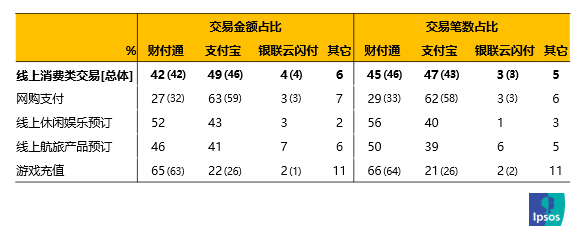 支付宝在线上消费类交易场景仍处领先地位,网购支付的主导优势依旧。支付宝在网购支付的领先优势稳固,其交易金额和笔数占比分别为63%和62%,而财付通分别为27%和29%,与上期相比差距拉大。在调查覆盖的线上休闲娱乐预订、线上航旅产品预订和游戏充值等线上支付场景,则是财付通占优,领先幅度也较明显。